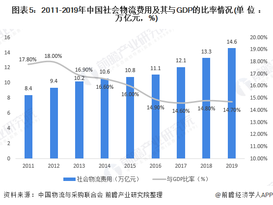 2019年,我國(guó)社會(huì)物流總費(fèi)用為14.6萬(wàn)億元,與GDP比率為14.7%,較2011年下降3.1個(gè)百分點(diǎn),結(jié)合長(zhǎng)期以來我國(guó)GDP總量的較大規(guī)模來看,現(xiàn)階段我國(guó)物流成本控制力度較以往有明顯提高,物流效率有所提升。