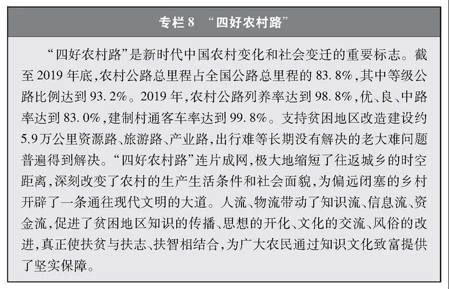“出行難”得到有效解決。農(nóng)村公路建設(shè)實(shí)現(xiàn)跨越式發(fā)展,“晴天一身土,雨天一身泥”成為歷史。截至2019年底,全國(guó)實(shí)現(xiàn)了具備條件的鄉(xiāng)鎮(zhèn)和建制村100%通硬化路;截至2020年9月,實(shí)現(xiàn)了具備條件的鄉(xiāng)鎮(zhèn)和建制村100%通客車。城鄉(xiāng)道路客運(yùn)一體化發(fā)展水平持續(xù)提升,以縣城為中心、鄉(xiāng)鎮(zhèn)為節(jié)點(diǎn)、建制村為網(wǎng)點(diǎn)的交通網(wǎng)絡(luò)初步形成,鄉(xiāng)村之間、城鄉(xiāng)之間連接更加緊密,6億農(nóng)民“出門水泥路,抬腳上客車”的夢(mèng)想變成了現(xiàn)實(shí)。