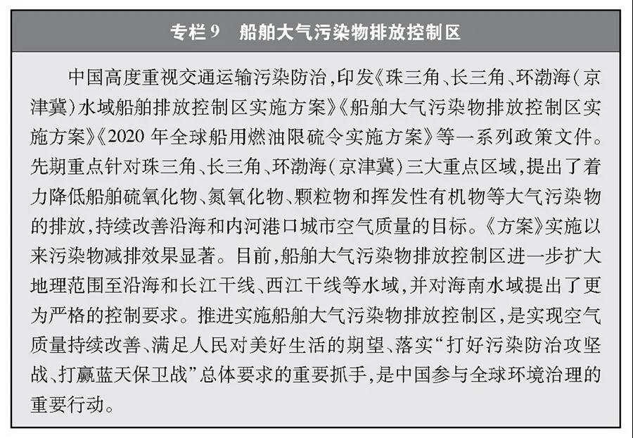 強(qiáng)化大氣與水污染防治。堅(jiān)決打好交通運(yùn)輸領(lǐng)域污染防治攻堅(jiān)戰(zhàn),用最嚴(yán)格的制度、最嚴(yán)密的法治治理環(huán)境污染。在沿海和長(zhǎng)江干線等水域設(shè)立船舶大氣污染物排放控制區(qū),按照國(guó)際公約要求對(duì)進(jìn)入中國(guó)水域的國(guó)際航行船舶實(shí)施船用燃油硫含量限制措施,推動(dòng)船舶使用清潔能源和加裝尾氣污染治理裝備,建立船用低硫燃油供應(yīng)保障和聯(lián)合監(jiān)管機(jī)制。執(zhí)行船舶水污染物排放控制國(guó)家強(qiáng)制性標(biāo)準(zhǔn),推動(dòng)港口船舶含油污水、化學(xué)品洗艙水、生活污水和垃圾等接收處置設(shè)施建設(shè),開(kāi)展港口粉塵污染控制。在全國(guó)沿海實(shí)施“碧海行動(dòng)”(注6)計(jì)劃,打撈存在污染環(huán)境風(fēng)險(xiǎn)和影響海上交通運(yùn)輸安全的沉船沉物。加快老舊和高能耗、高排放營(yíng)運(yùn)車輛、施工機(jī)械治理和淘汰更新,推進(jìn)實(shí)施機(jī)動(dòng)車排放檢測(cè)與強(qiáng)制維護(hù)制度(I/M制度)。中央財(cái)政采取“以獎(jiǎng)代補(bǔ)”方式支持京津冀及周邊地區(qū)、汾渭平原淘汰國(guó)Ⅲ及以下排放標(biāo)準(zhǔn)營(yíng)運(yùn)柴油貨車。全面開(kāi)展運(yùn)輸結(jié)構(gòu)調(diào)整三年行動(dòng),2012年至2019年全國(guó)機(jī)動(dòng)車污染物排放量下降65.2%。