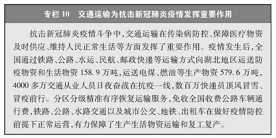 應(yīng)對(duì)突發(fā)公共事件處置能力顯著提升??茖W(xué)高效應(yīng)對(duì)各類突發(fā)公共事件,健全工作體系,提升應(yīng)急能力。新冠肺炎疫情發(fā)生后,中國(guó)果斷做出“一斷三不斷”(注7)部署,適時(shí)推出鐵路“七快速”(注8),公路“三不一優(yōu)先”(注9),水運(yùn)“四優(yōu)先”(注10),民航客運(yùn)“五個(gè)一”(注11)、貨運(yùn)“運(yùn)貿(mào)對(duì)接”(注12)以及郵政“綠色通道”等政策措施,一方面全力阻斷病毒通過(guò)交通工具傳播,另一方面保障全國(guó)各地應(yīng)急物資運(yùn)輸和人民生活需求,為打贏疫情防控人民戰(zhàn)爭(zhēng)、總體戰(zhàn)、阻擊戰(zhàn)提供了有力支撐。